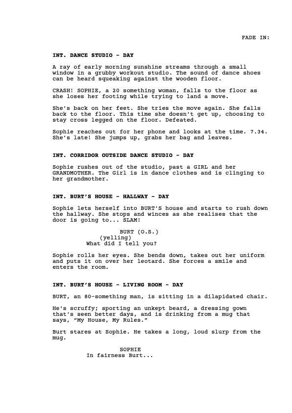 ‘Burt’ was retooled and rewritten as a short film and was a semi-finalist in the RIFF Screenwriting Competition 2022. It is also in the top 22% of all projects on Coverfly.com. The film focus is now on Sophie, a carer with aspirations to become a dancer, who feels stuck in life due to looking after her belligerent client, Burt.